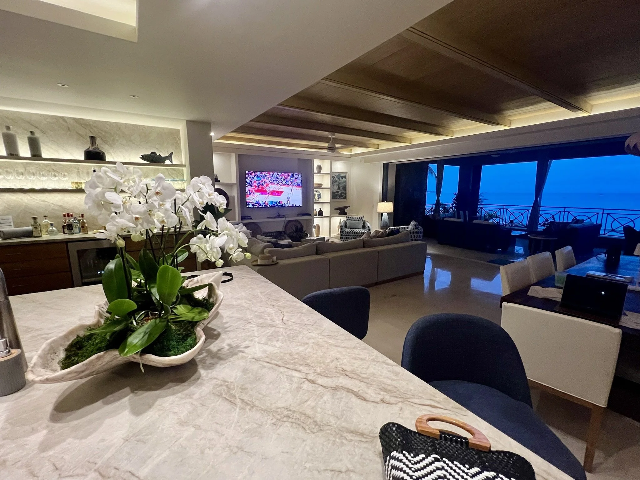 The expansive living area is designed to bring everyone together in comfort while showcasing the home’s stunning beachfront setting. Floor-to-ceiling glass doors fully open to the covered terrace, allowing the indoor living room and outdoor lounge to flow together as one seamless space. With generous seating, warm modern finishes, and sweeping views of the ocean, beach, pool, and golf course, this light-filled gathering space is ideal for relaxing, entertaining, or simply enjoying the view throughout the day.